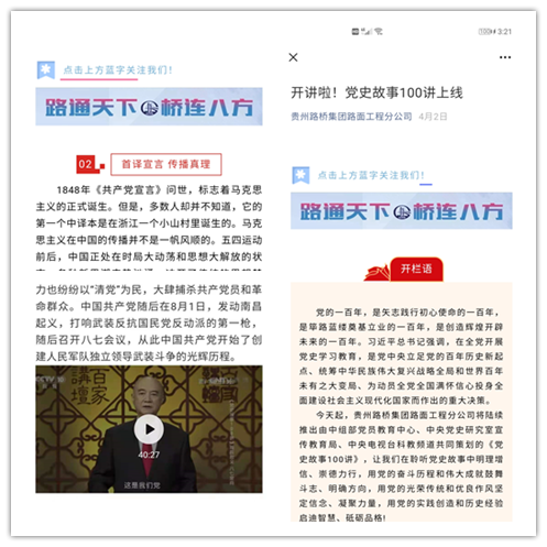 在線上,路面工程分公司充分用好“學(xué)習(xí)強國”學(xué)習(xí)平臺、“黨史學(xué)習(xí)教育”官方公眾號等載體,引導(dǎo)黨員通過手機隨時隨地聽黨史、讀黨史,有效提高黨史學(xué)習(xí)效率。與此同時,積極打造自身的宣傳陣地,在公司官方微信號中開設(shè)了《黨史故事100講》《黨史朗讀者》《沿著項目學(xué)黨史》等專欄,采用視頻、音頻、文字和圖片等多種形式進行推送報道,分享紅色故事,引導(dǎo)廣大黨員干部職工積極參與黨史學(xué)習(xí)教育,從“要我學(xué)”到“我要學(xué)”,從黨史故事的觀看者變成黨史故事的分享者。截至目前,線上專欄共推出專題報道32篇。